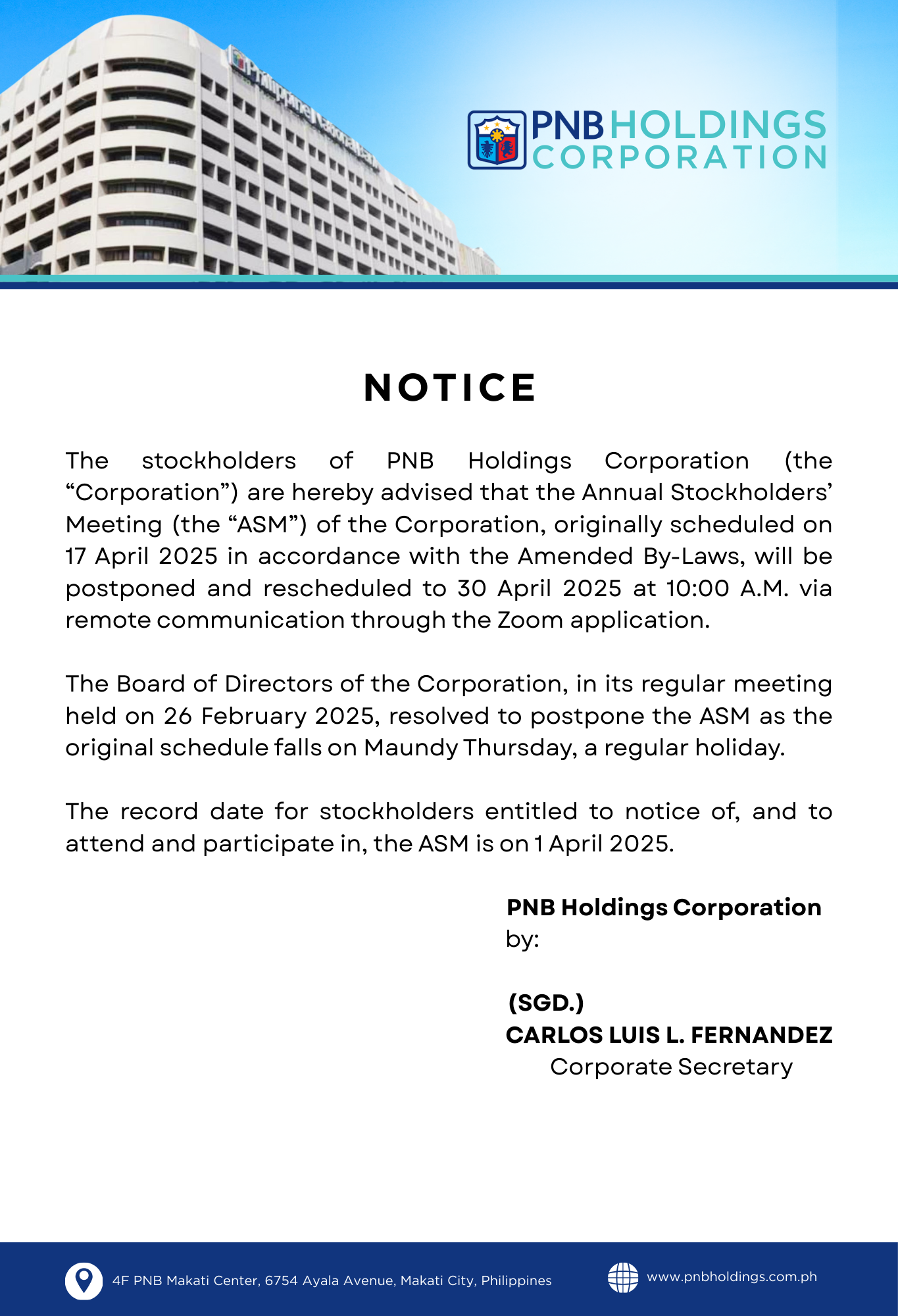 PNB Holdings Corporation will hold its Annual Stockholders’ Meeting on 30 April 2025 at 10o’clock in the morning via remote communication.